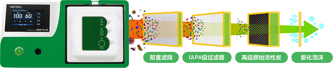 有效的烟雾过滤系统采用4级ULPA过滤技术,可从手术部位去除99.999%的烟雾污染物
